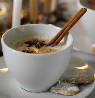 Hæld mælken i en gryde og tilsæt to stjerneanis og to knsp. kanel (gem resten til drys). Varm mælken op til kogepunktet.