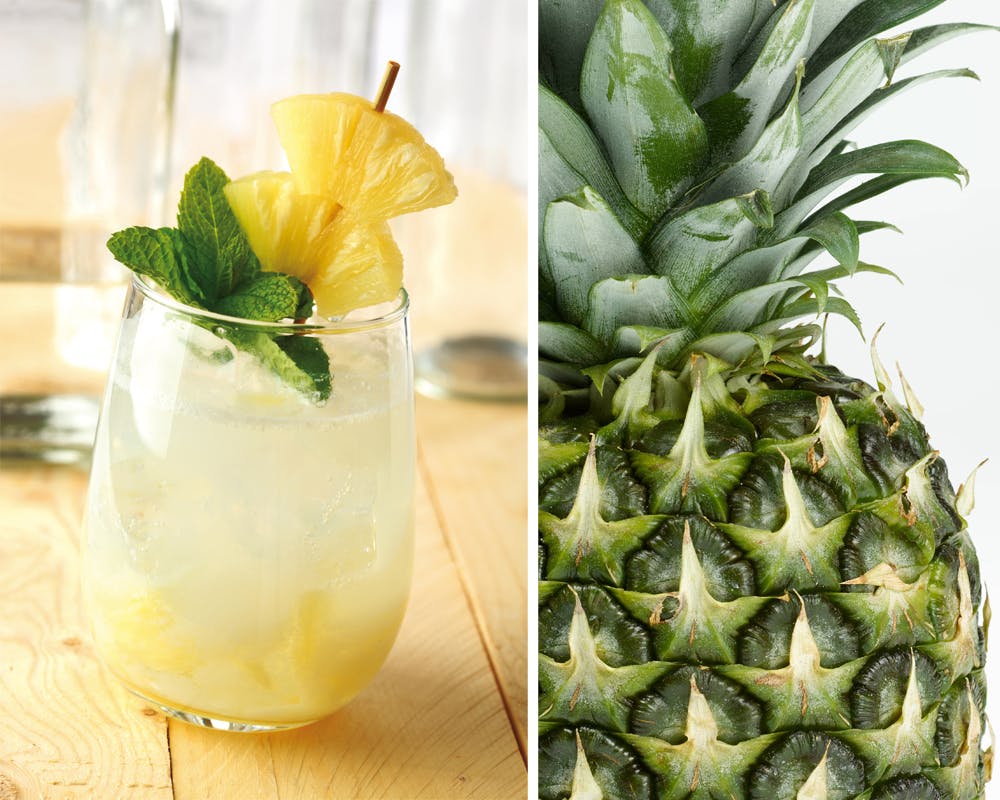 Hæld drinken i et glas – gerne iskoldt fra fryseren – og pynt med et stykke ananas og en myntekvist.