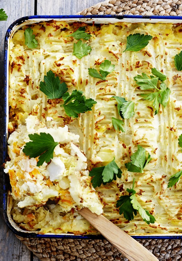 Når du laver en ret som den her, bliver det lige pludselig meget nemt at spise den sunde fisk! Kartoffelmosen lægges som et dækkende låg over torskefileten, så fisken bevarer sin saft og blødhed - også efter en tur i ovnen. I stedet for torsk kan du også sagtens bruge rødspætte, kuller eller sej. Prøv også: Lynstegt torsk med dampet spinat