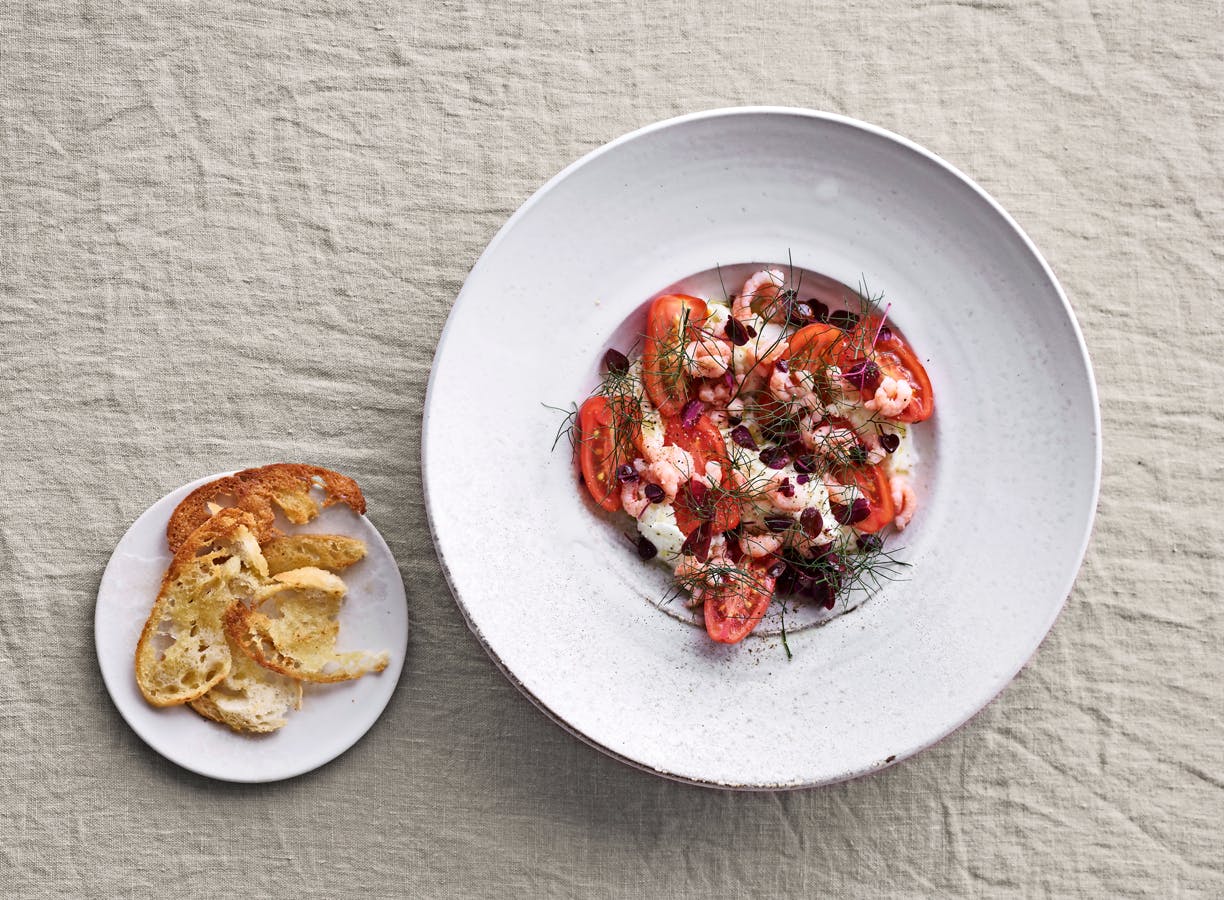 Det skal du bruge for at lave fjordrejer med burrata, tomater og skovsyre