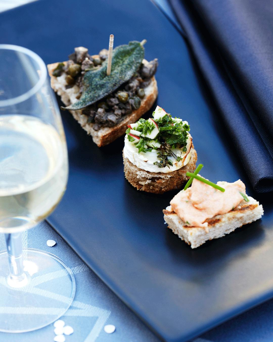 Crostini med forskelligt fyld er en delikat nippe-forret, og kan sagtens laves dagen før. Få opskriften her! (link fjernet)