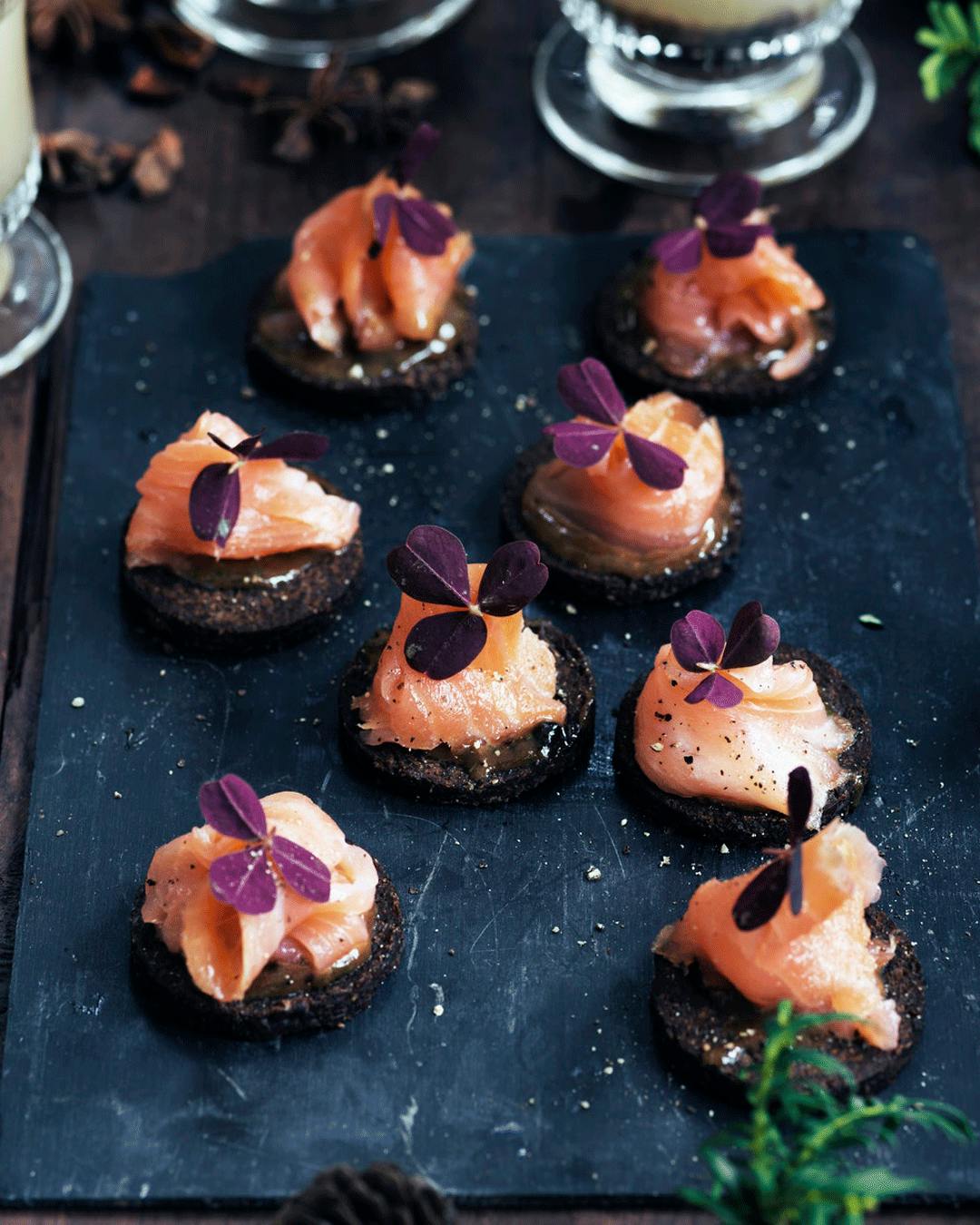 Laks, pumpernikel og dressing kan tilberedes dagen forinden, og så samles og anrettes de fine små hapsere blot lige inden servering. Opskrift på denne forret der kan laves dagen før her! (link fjernet)