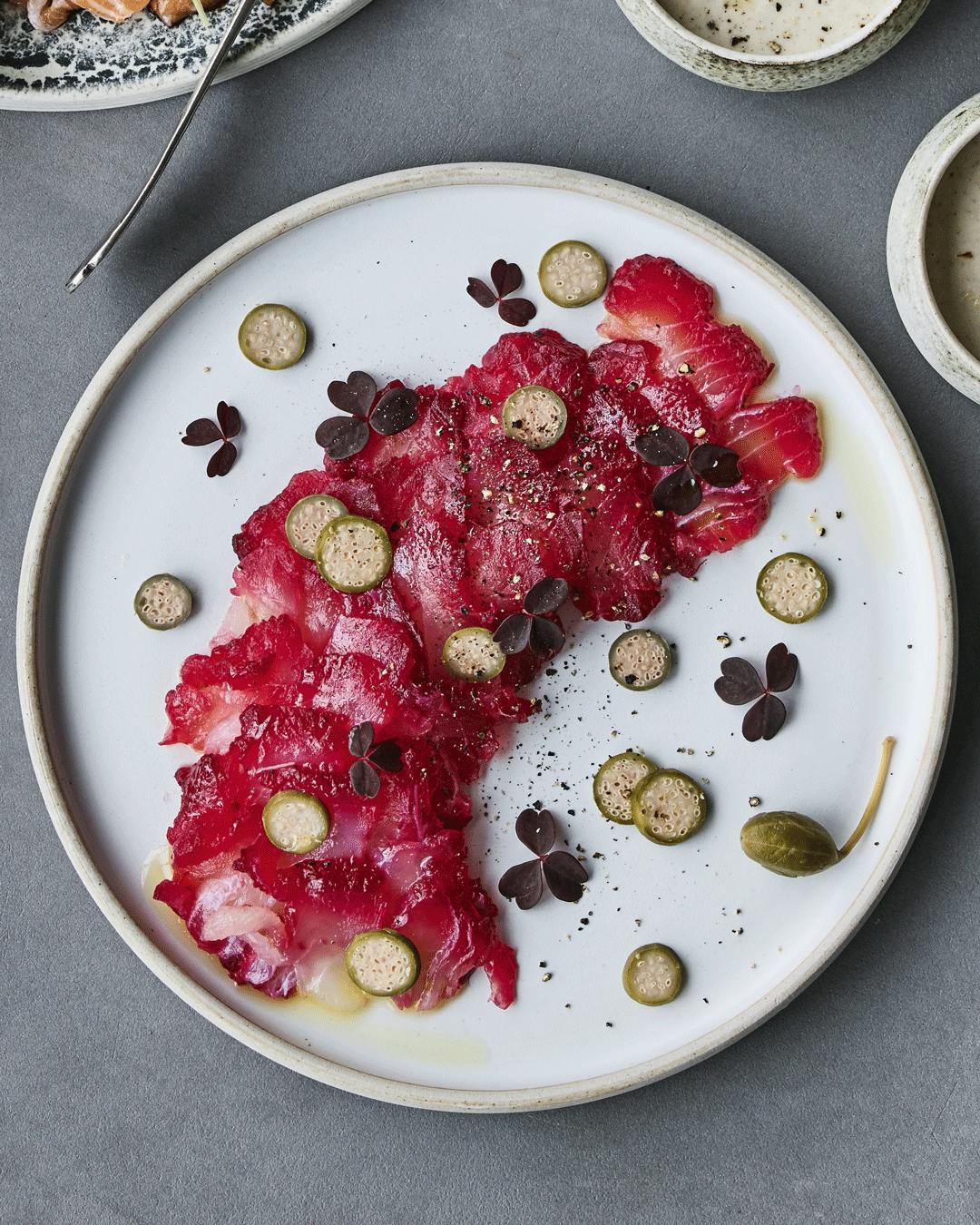 Denne forret vil helt sikkert imponere gæsterne og kræver også lidt mere af kokken. Men fordelen er, at den kan laves hele 5 dage i forvejen. Den tilhørende kompot kan laves dagen i forvejen, og så er der bare tilbage at anrette forretten på selve dagen. Opskrift på denne forret der kan laves dagen før her! (link fjernet)