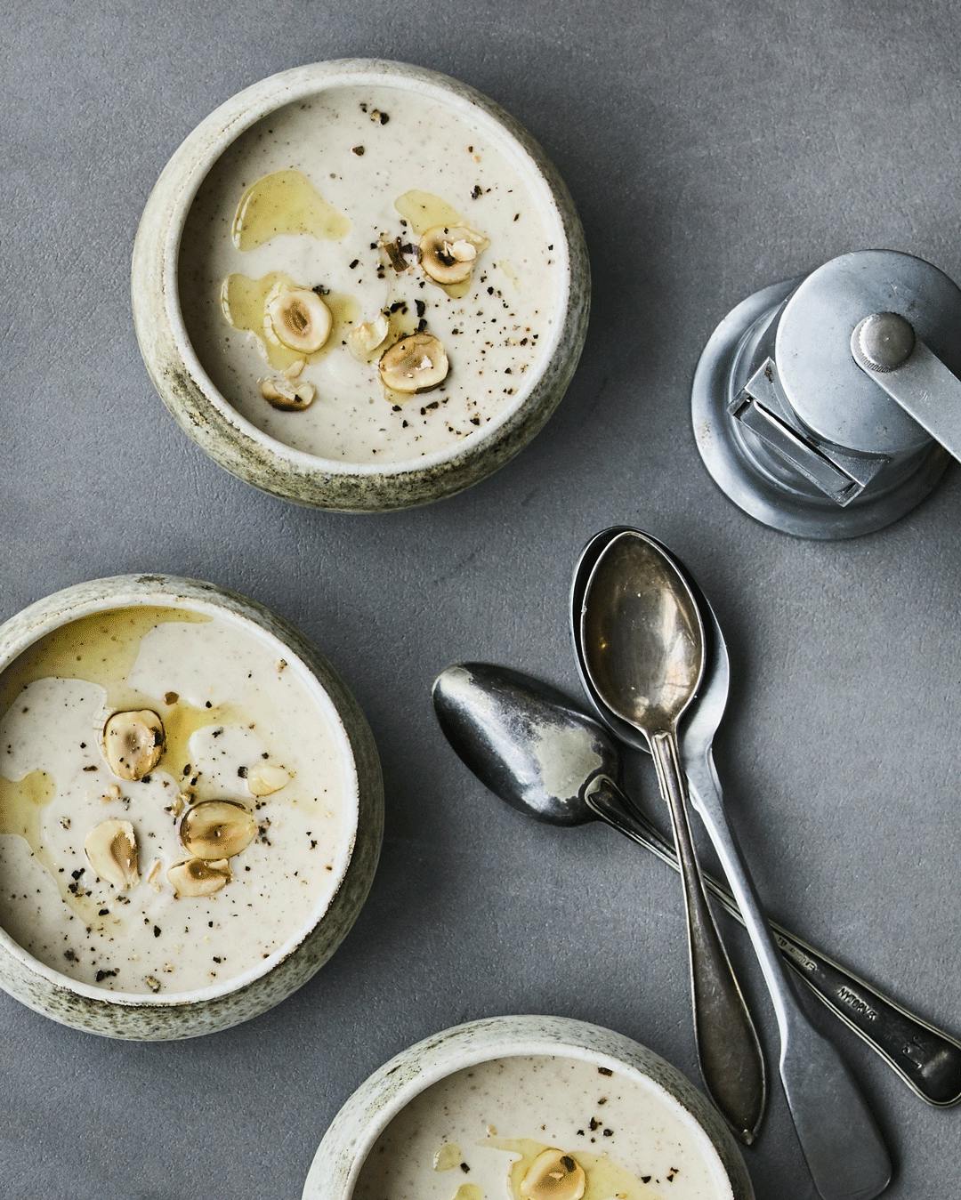 Denne gode og festlige suppe kan laves dagen forinden. Du skal blot koge suppen, blende den og så stille den i køleskabet natten over. Næste dag varmer du den op og tilsætter fløde, salt, peber og citronsaft, og anretter hver varme skål suppe med trøffelolie. Opskrift på denne forret der kan laves dagen før her!