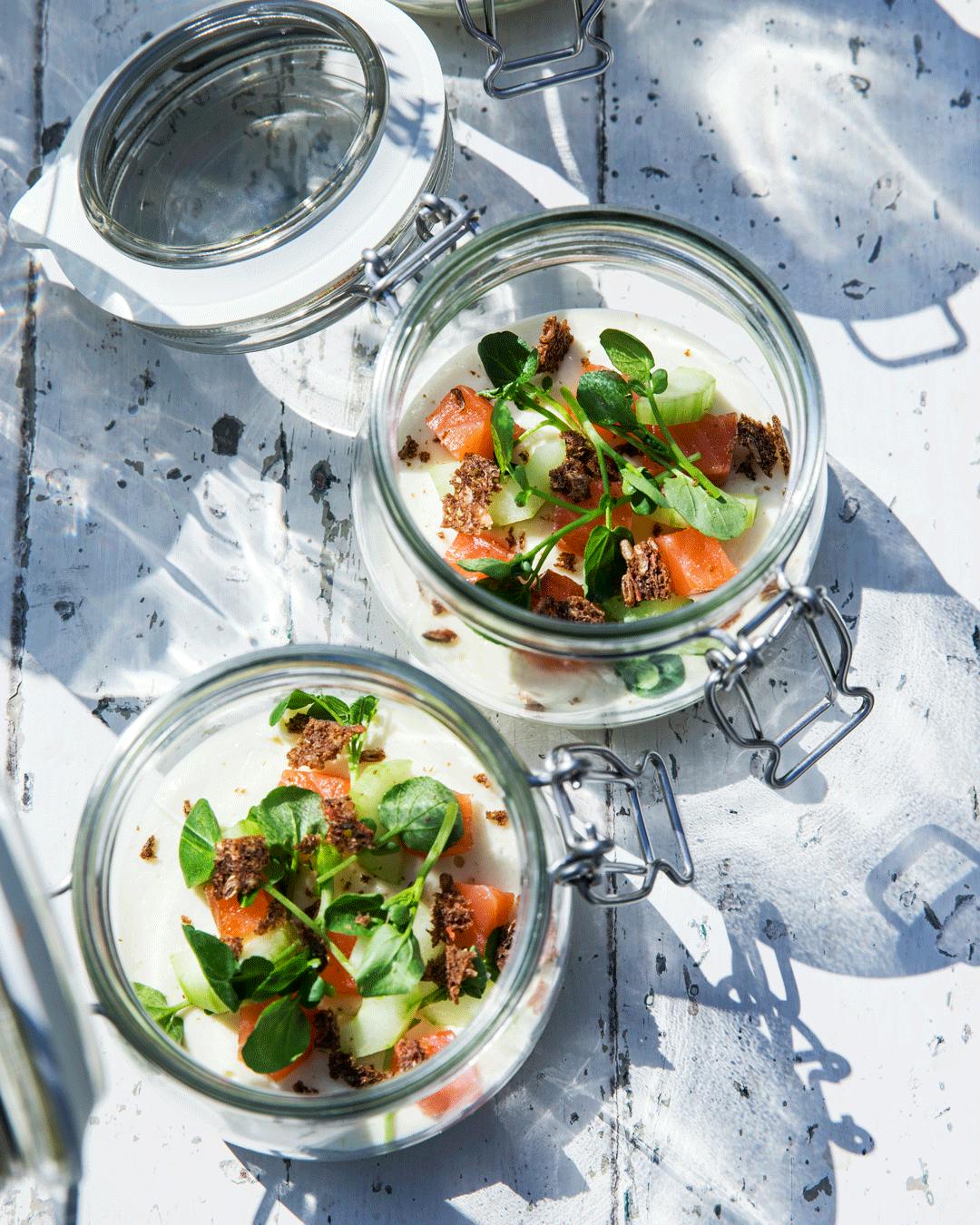Denne lækre lakserillette med krydderurter og ristet rugbrød kan laves og anrettes i glas dagen inden, hvis du ønsker det. Har du lidt tid på selve dagen, kan du vælge at riste rugbrødet et par timer inden. Opskrift på denne forret der kan laves dagen før her!