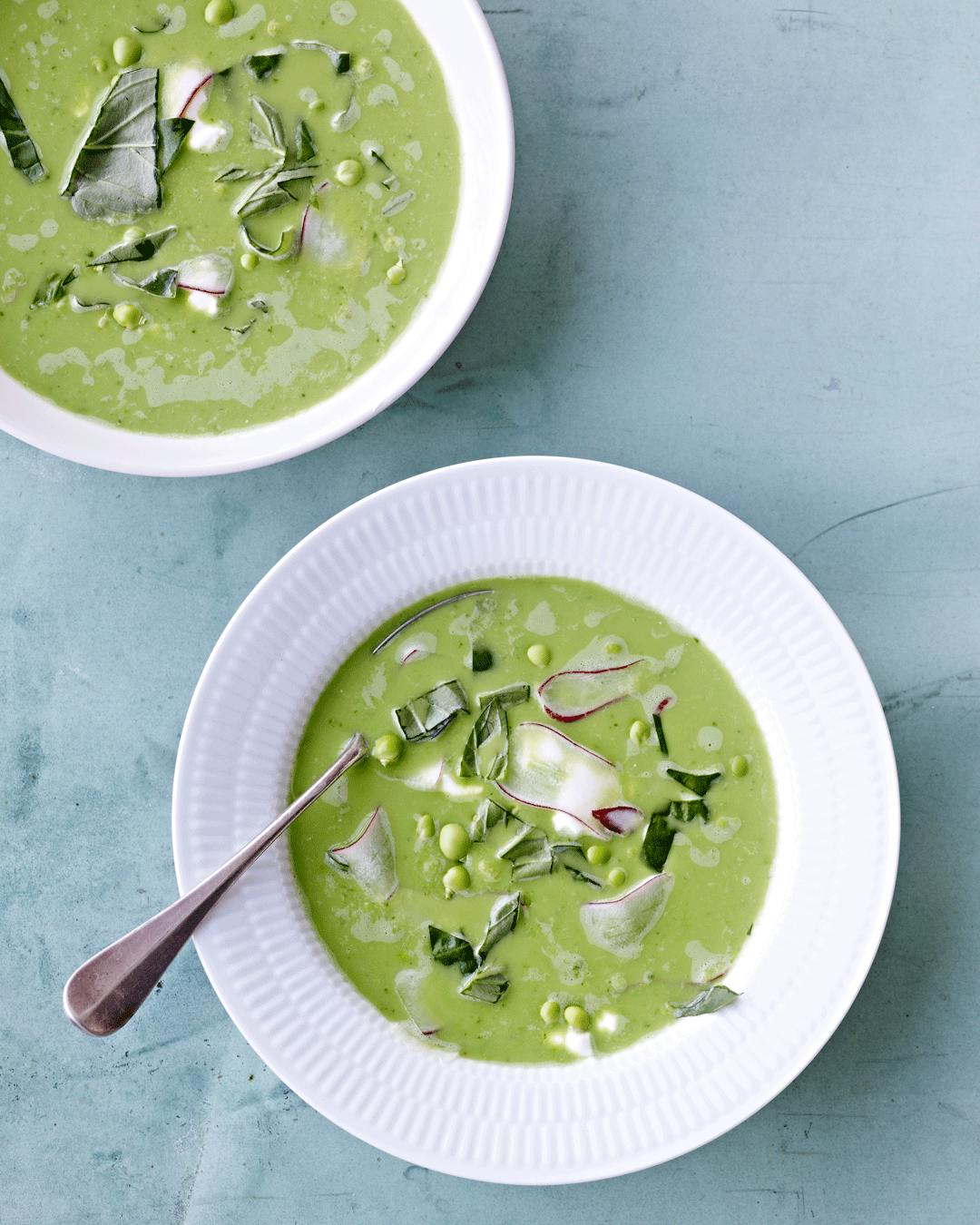 Fordelen ved denne ærtesuppe med radise og rygeost er, at den serveres kold. Du kan derfor lave suppen aftenen før og blot tilsætte radise og rygeost på selve dagen. Opskrift på denne forret der kan laves dagen før her!