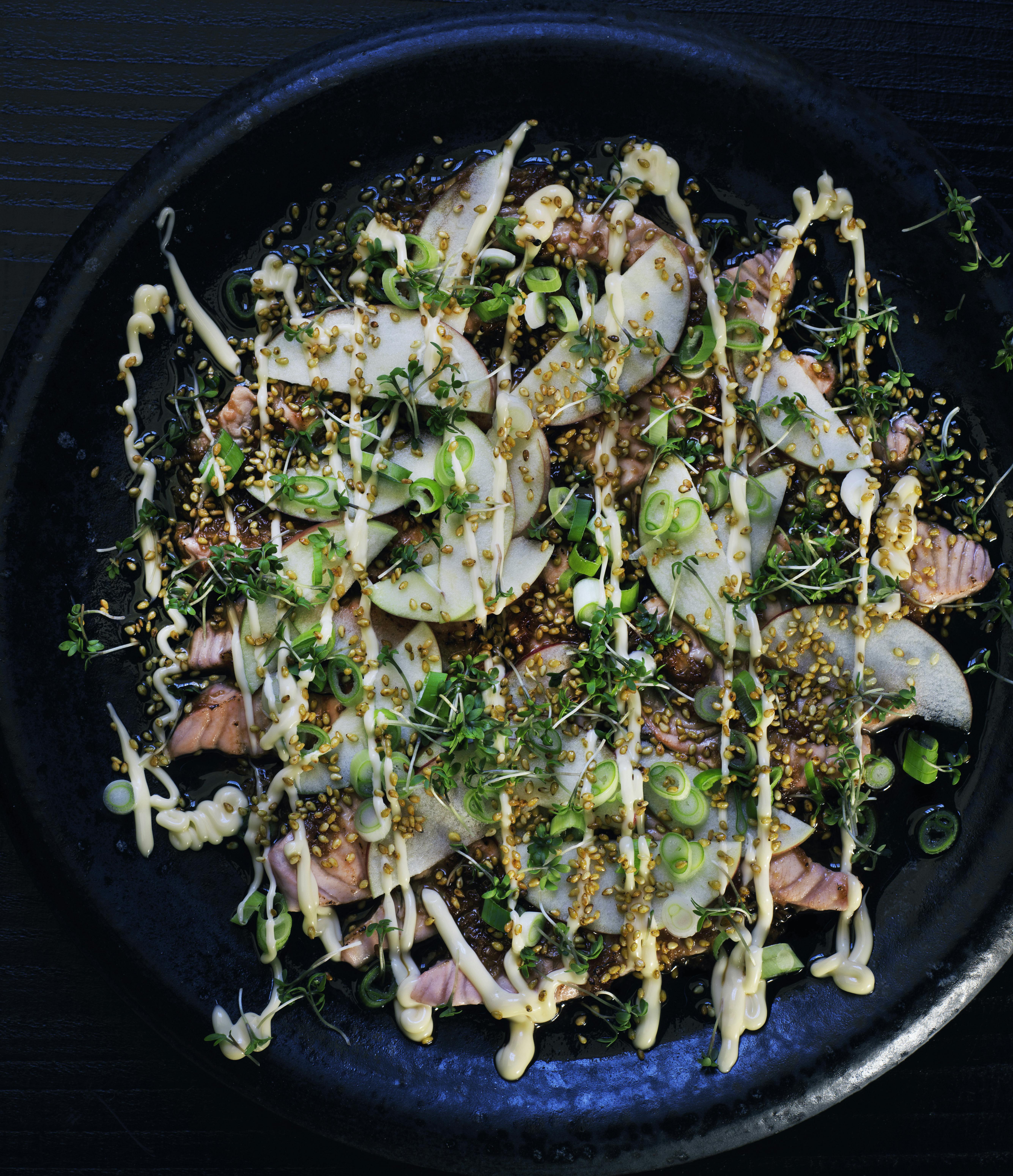 Opskrift på forret med brændt laks med sesam, æble og japansk mayonnaise
