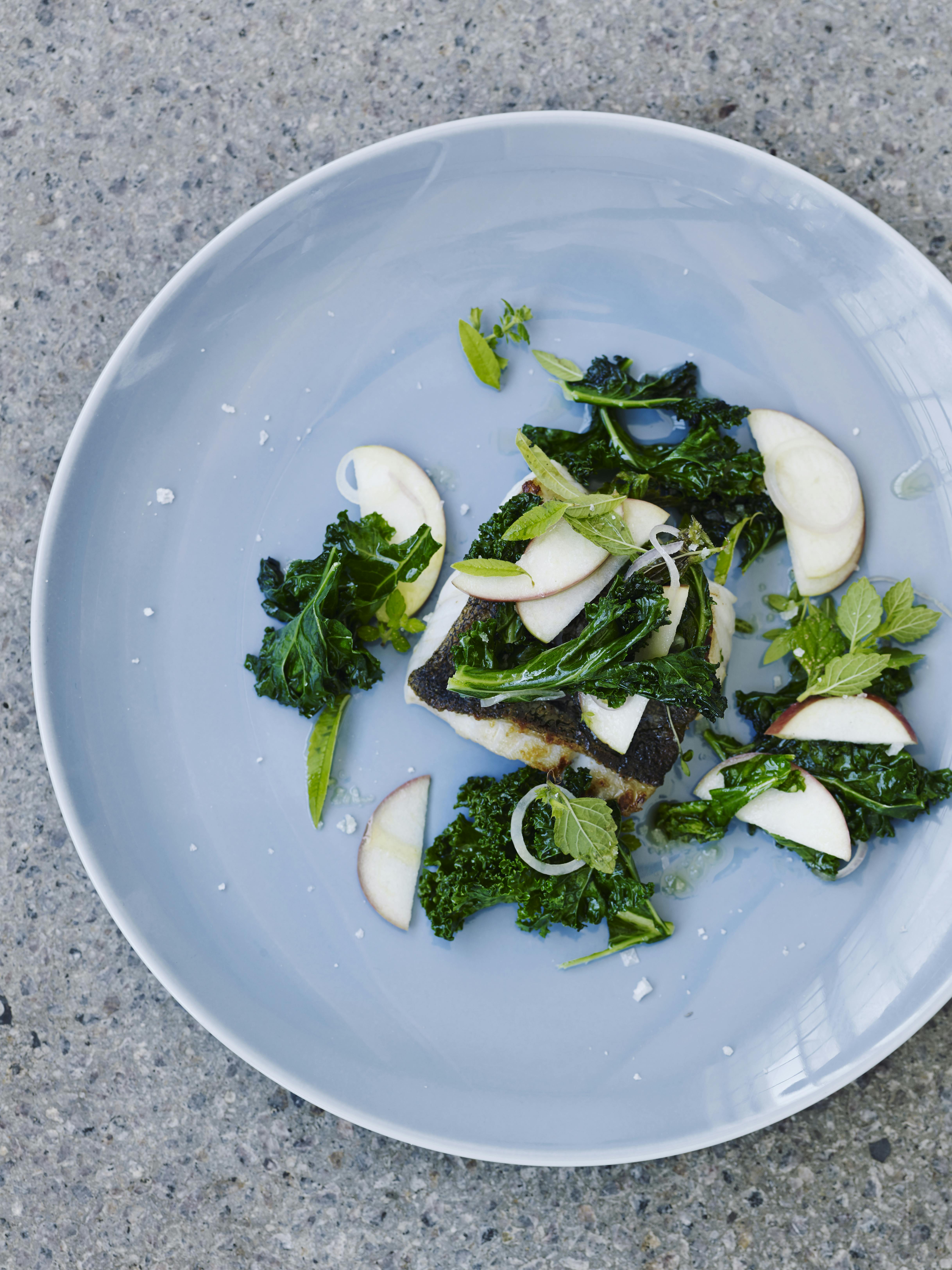 Det skal du bruge til forret med sprødstegt torsk med stegt grønkål, æble og skalotteløg