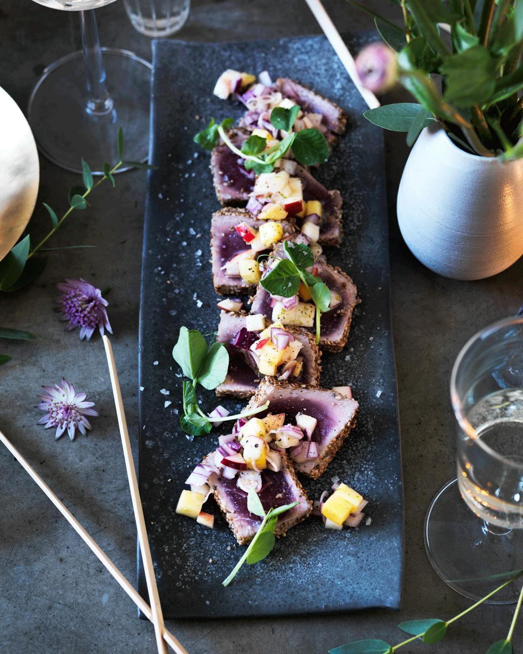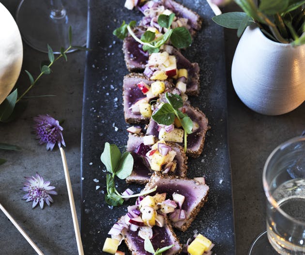 Giv dine gæster en forret, de sent vil glemme. Her får du opskriften på lynstegt tun med æble-mangosalsa og ærtespirer. Få opskriften her! (link fjernet)