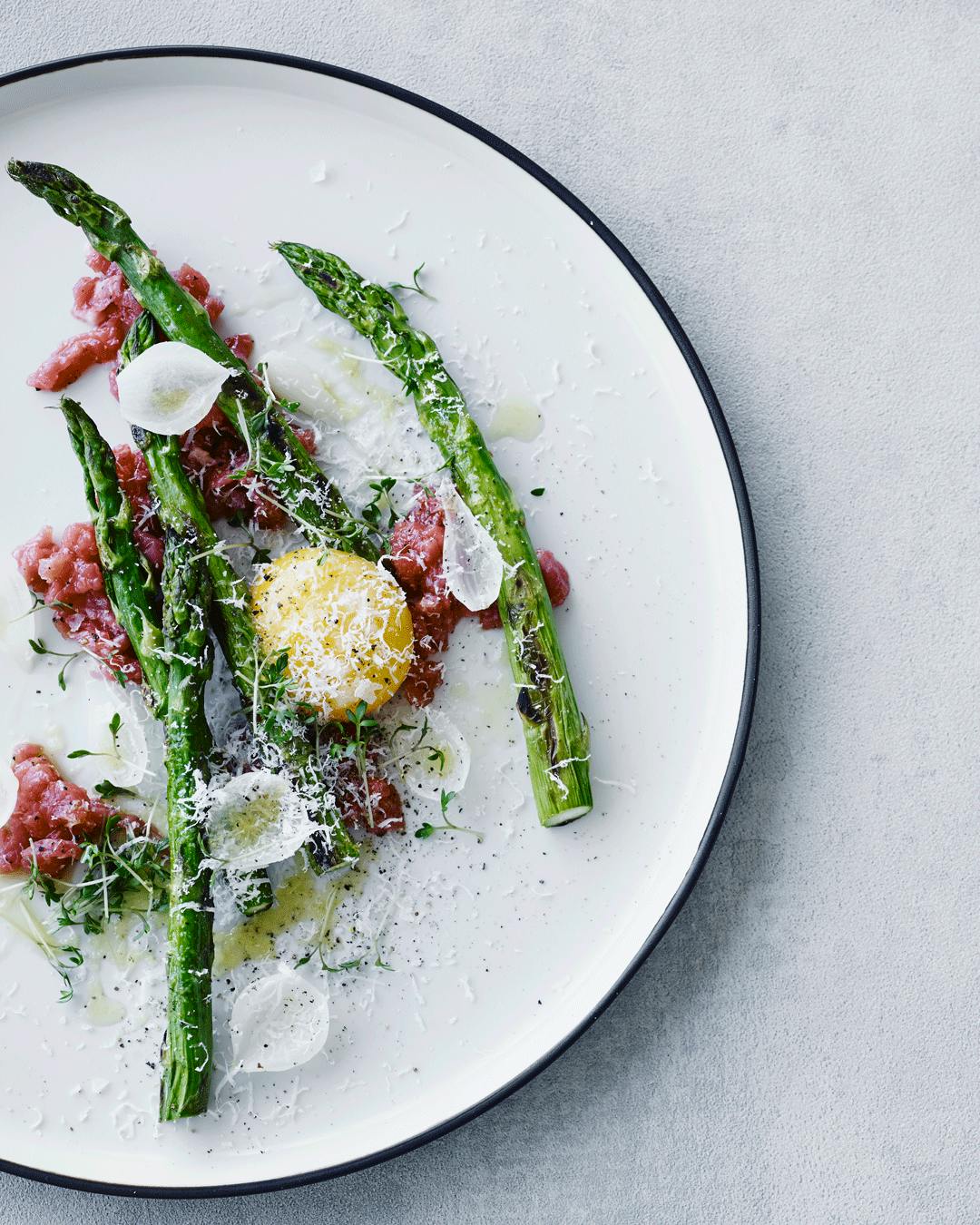 Lav en smagslækker kalve-tatar med stegte asparges, syltet løg, parmesan, karse og æggeblomme. Få opskriften på tatar her! (link fjernet)