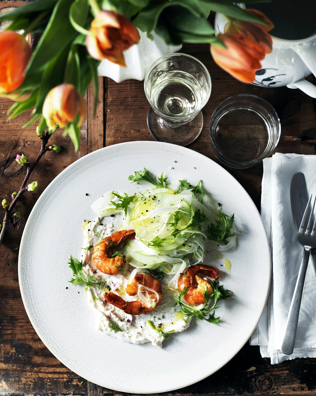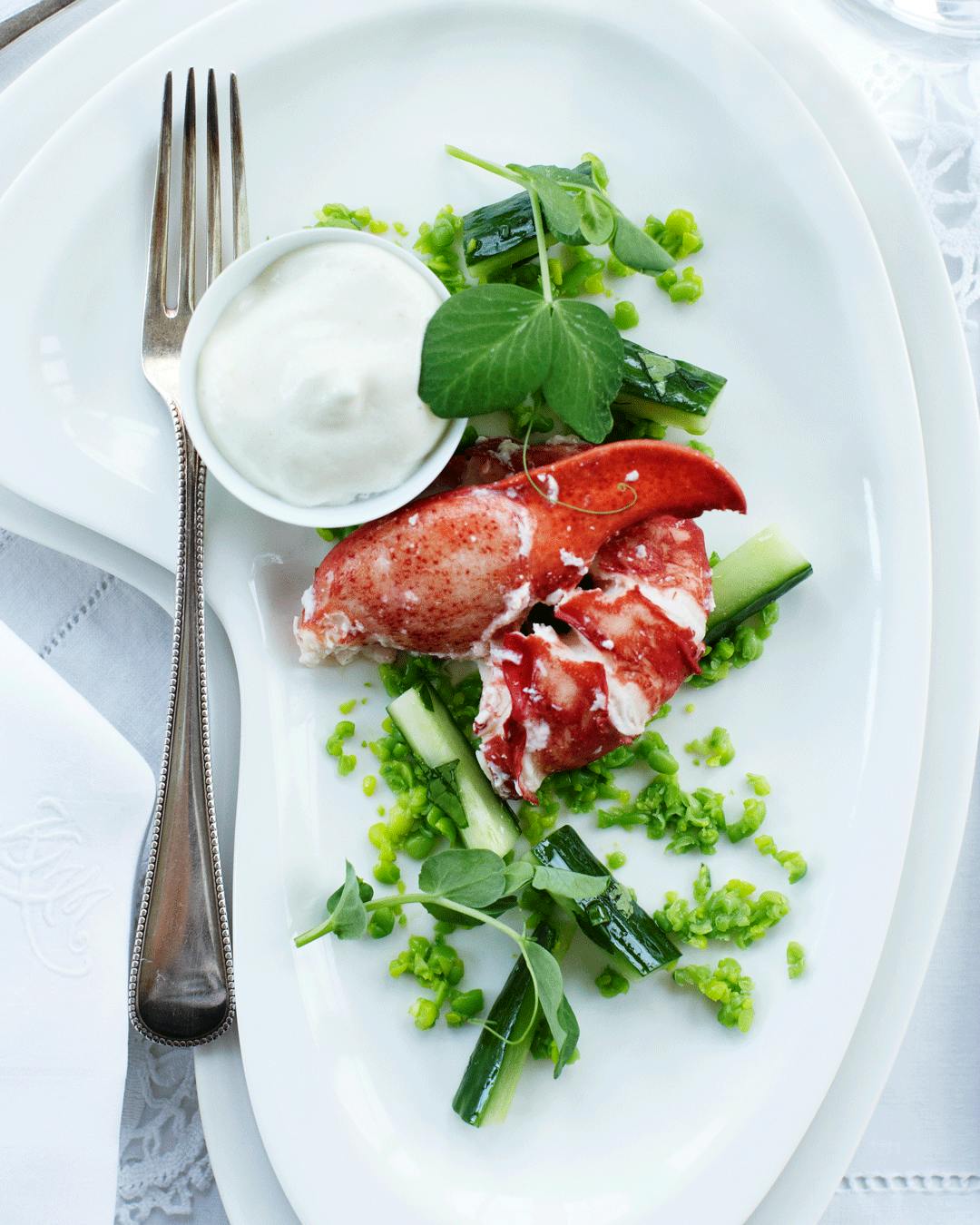Enkelt, friskt og smukt. Hummer opskrift med ærter, agurk og fnuglet mayounnaise. Forretten i den lækre menu, hvor du kan skabe restaurantstemning i dit eget hjem. Få opskriften her! (link fjernet)