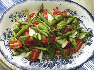 En lækker salat af let kogte grønne asparges, mozzarella, basilikumblade og langtidsbagte halve daddeltomater.