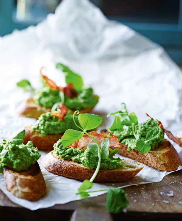 Bruschetta er en klassisk italiensk forret eller snack, som er dejlig nem at lave og som altid smager af mere. I denne opskrift har vi byttet tomaterne ud med lækre ærter, der med deres skønne grønne farve og dejlige, knasende smag emmer af forår. Velbekomme.