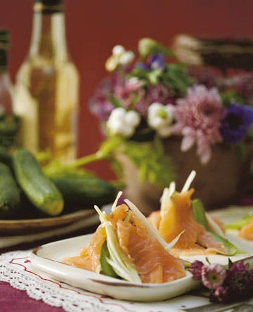 Skær agurkerne i fine tynde skiver på langs. Kom dem i en skål, drys salt over og lad dem salte let et par timer. Rens fenniklerne og snit dem fint. Ved anretning blandes de med drueagurkerne og vendes i en marinade af olie, citronsaft, salt og peber. Skær laksen i tynde skiver og anret dem med salaten