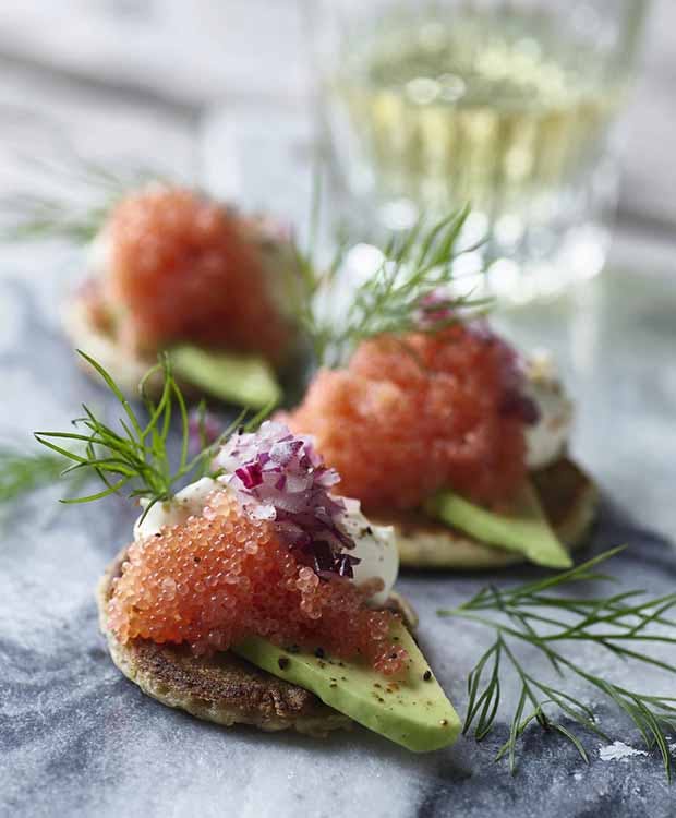 Hjemmelavede blinis med avocado og stenbiderrogn