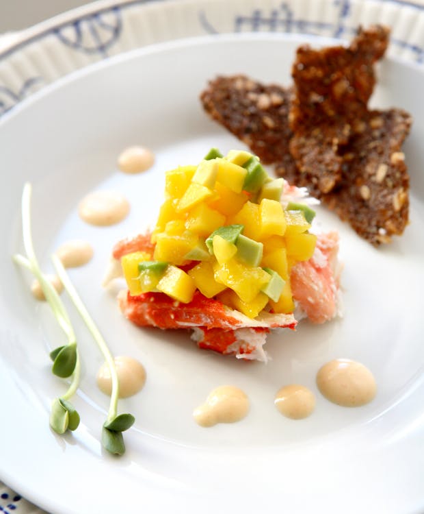 Forkæl dine gæster med denne fantastiske forret, hvor det saftige og velsmagende kongekrabbekød spiller hovedrollen. Med selskab af en frisk mango-avocado-salsa og hjemmelavede knasende sprøde rugbrødschips er der garanti for en skøn smagsoplevelse. Velbekomme!