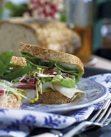 Rist de 12 skiver brød. Dryp dem med olivenolie. Smør gedeost på hver skive. Læg en skive røget hellefisk på 6 af brødskiverne. Halver avocadoerne, og skær dem i fine skiver. Læg ½ skive skåret avocado på brødet. Dryp med citronsaft hen over. Pynt med lucernespirer. Vask radiserne, skær dem i tynde skiver, og læg dem på sammen med friske babyspinatblade. Luk sandwichen med de resterende brødskiver, og skær sandwichen i trekanter.