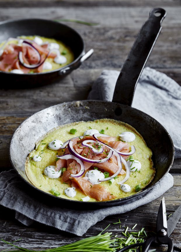 Vi har valgt at bruge kokosmælk i omeletten, da den giver en spændende smag med et lille hint af sødme. Du kan sagtens erstatte cremefraiche med skyr, hvis du har lyst.