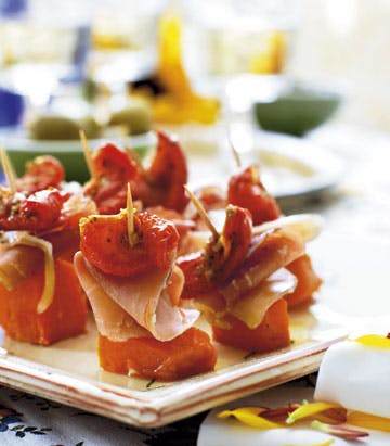 STICKS: Sæt en semidried tomat, en skive parmaskinke og et stykke bagt græskar på hver stick, og server.