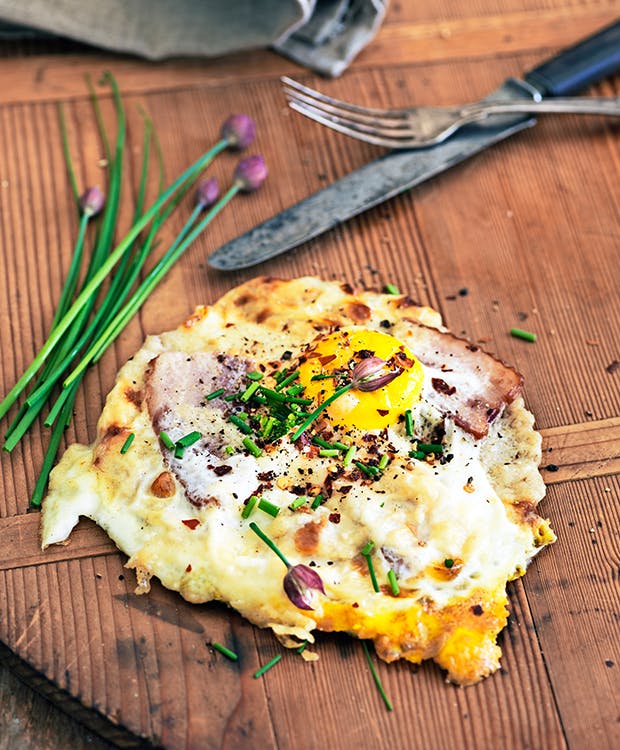 "Croques" er franske luksus-toasts med ost, skinke og sennepssovs og findes i både en monsieur- og en madame-version. Forskellen mellem de to er, at croques madame har et lækkert spejleæg på toppen. Her får du opskriften på den franske specialitet i en mini-pizza version med purløg på toppen.