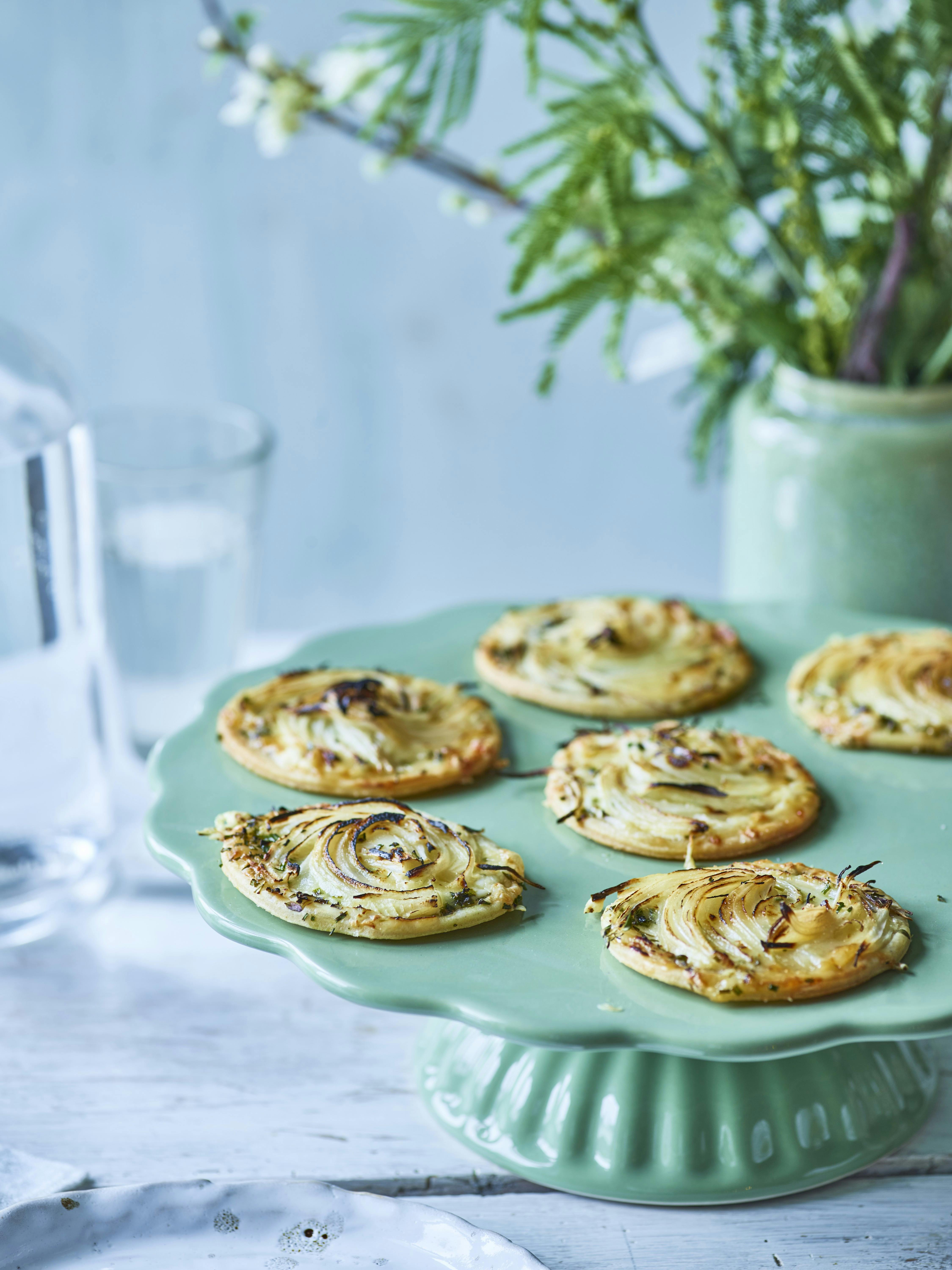Fordel løgskiverne oven på tærtebundene, evt. i et fint mønster.