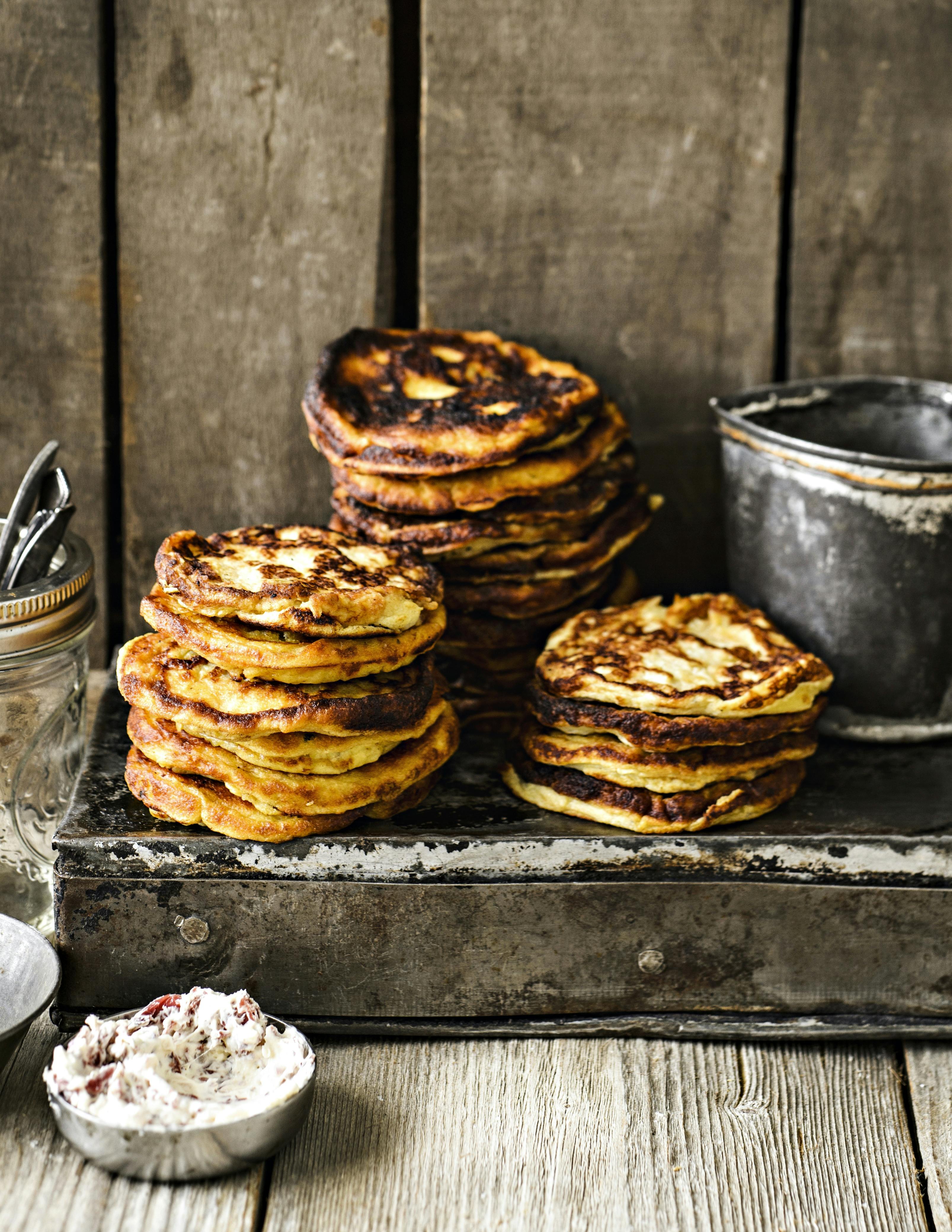 Steg massen til små kartoffelpandekager i smør på en pande, til de er gyldne.