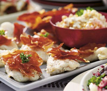 Skær torskefileten i 8 pæne stykker, og læg dem på en tallerken. Drys fiskestykkerne med salt og peber, og lad dem trække i køleskabet en times tid. Bag parmaskinken i ovnen på en rist med bagepapir i 15 minutter ved 170º, og lad den køle af.