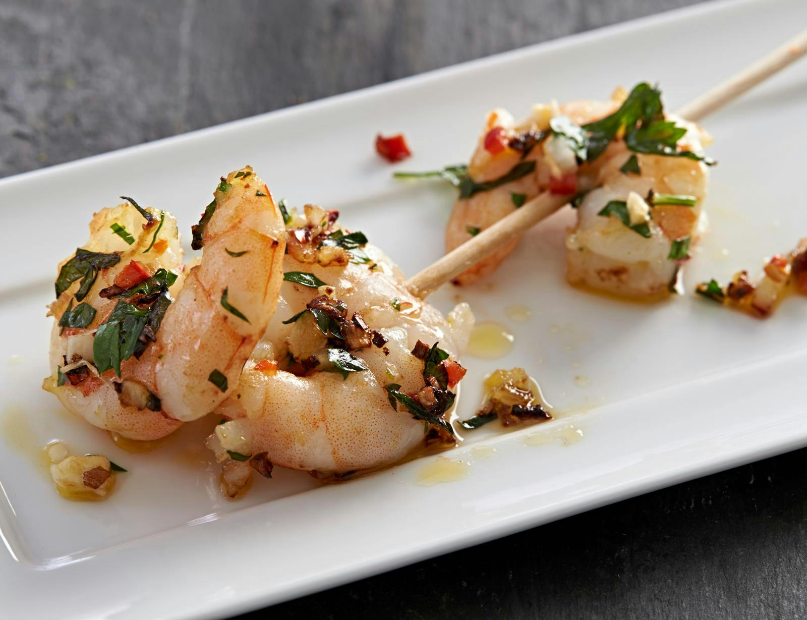 Rejecocktail med lune flûtes til er en klassiker - lav den med tigerrejer, mandler og spidskål.