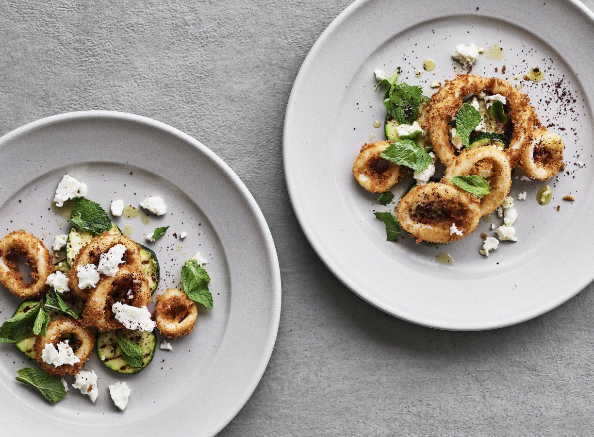 Opskrift: Friterede blæksprutteringe med grillet squash, mynte, feta og sumak
