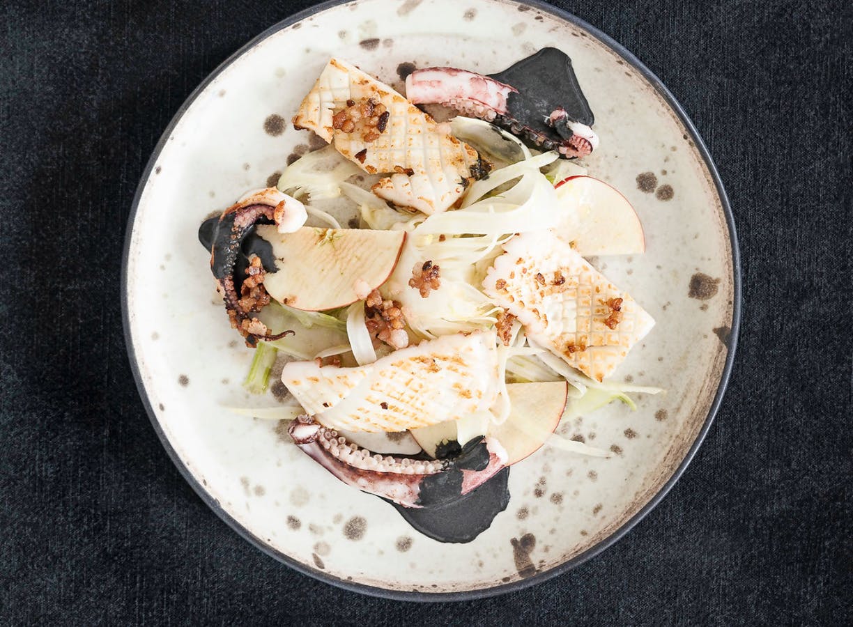 Anret svinefedt og blæksprutten i en skål, fordel fennikel og æble over, og slut med en skefuld sauce på blæksprutteblæk.