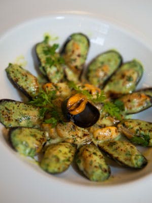 Hæld nu saucen over hver enkelt musling, og gratiner dem i ovnen på grill ved maks. varme, til blåmuslingerne har fået en flot farve. Server med det samme.