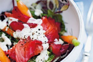 Fjern rødbede, peberrod og dild og skær skindet fra din gravad laks med en skarp filetkniv. Skær derefter i tynde skiver og server din gravad laks sammen med salaten.