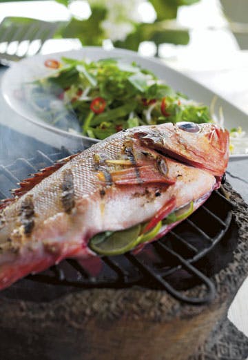 Rengør grønsagerne. Skær sukkerærter, chilier og forårsløg i tynde skiver. Bland de snittede grøntsager med bønnespirer og spinat. Top med thaibasilikum og koriander. Rør en dressing af sesamolie, lime saft, salt og peber. Hæld dressingen over salaten og server den til den grillede rødfisk. Server evt. brød til.