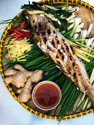 Rens fisken, og behold hoved og hale. Skær fisken op på mavesiden, og skær små riller på begge sider af fisken, så urterne kan komme ind i kødet, og samtidig bliver fisken hurtigere stegt. Drys salt og peber på en tallerken, og lad det stå klar. Bank på citrongræs med en kniv, så duft og smag kan træde frem. Skræl ingefæren, og skær den i strimler. Gnid fisken udvendig med ingefær og citrongræs, og læg derefter urterne ind i maven på fisken sammen med 3-4 hele forårsløg. Gem ca. halvdelen af ingefæren. Ingefærsauce: Hak hvidløg, chili og ingefær fint, og bland med resten af ingredienserne. Rør det godt op indtil sukkeret er opløst. Tilberedning: Grill fisken ca. 3-4 min. på hver side til den er stegt og saftig. Grill de resterende forårsløg og ingefærstrimler som tilbehør til fisken. Server fisken med grillede forårsløg og ingefær og ingefærsaucen fordelt i fire små skåle.