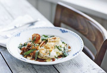 Steg havtaskemedaljonerne på en varm pande med vindruekerne-olie og en klat smør. Steg dem 2 minutter på hver side. Steg kammuslingerne 1 minut på hver side og krydr med salt og peber.