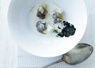 Bring suppen i kog, kom fiskefonden på og lad det simre i 10 minutter. Smag til med fløde, salt og evt. lidt hvid peber. Lun muslingerne i den færdige suppe lige inden servering.