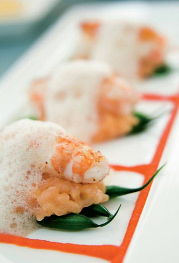 Steg skalotteløg gyldne i smør og tilsæt ris og lidt hvidvin. Tilsæt safran og bouillon lidt efter lidt til konsistensen bliver al dente. Smag til med salt og peber. De pillede jomfruhummere lynsteges et minut på en pande og anrettes oven på bønner og små bolde af safranris.