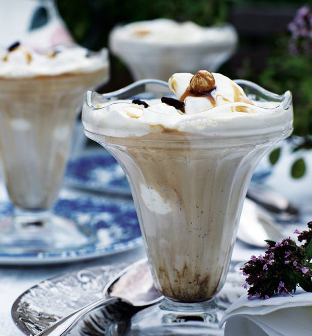 Pisk fløden til skum. Hæld kaffe i et glas, og læg en kugle is i glasset. Top med flødeskum, og pynt med hasselnøddesirup og et par kaffebønner.