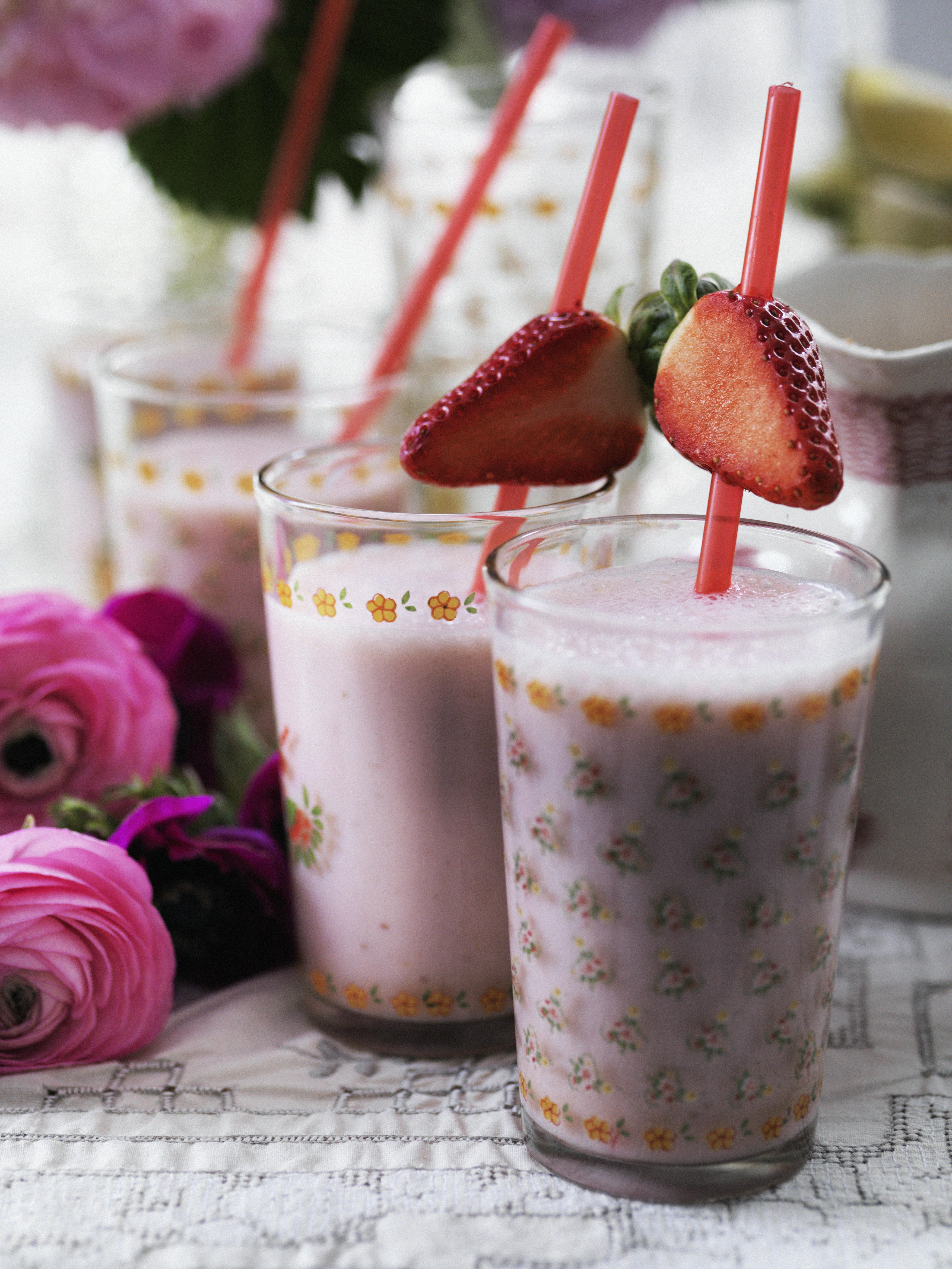 En kold milkshake er en fantastisk sommerdrik, hvis du trænger til en let dessert eller et sødt mellemmåltid. Den her er blød og fyldig uden at være tung og fed. Du kan sagtens skifte jordbær ud med ferskner, hindbær eller melon, og du kan også bruge frosne bær.