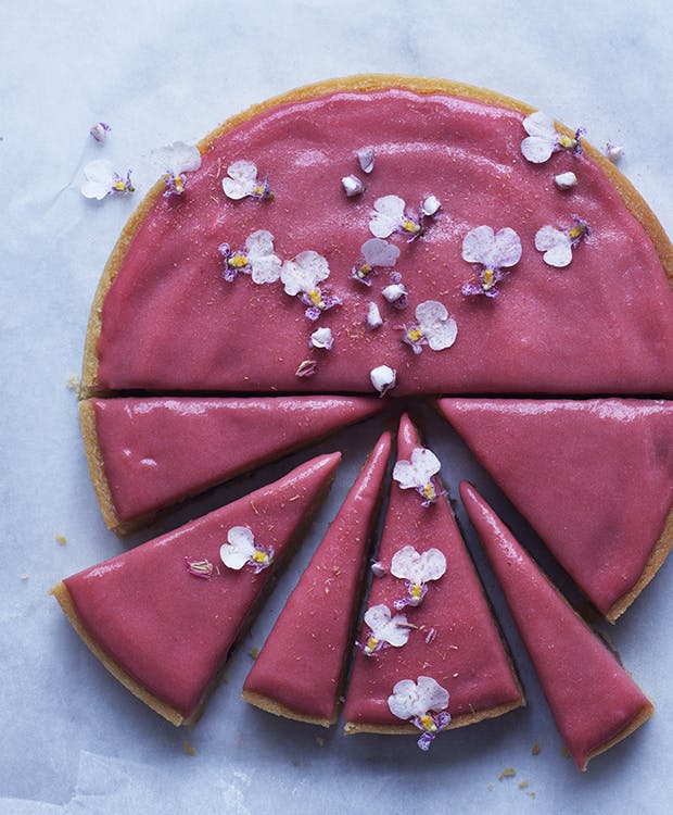 Denne rabarbertærte er ikke bare superflot med lyserød rabarbercurd og pynteblomster på. Den smager også himmelsk - prøv selv opskriften her!