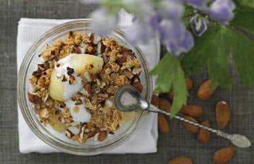 Flæk den anden halve vaniljestang, og skrab kornene ud. Rør dem i yoghurten sammen med flormelis. Saml din æblekage skiftevis med lag af æblekompot, havregryn og mandler i et glas, og slut af med den søde vaniljecreme.