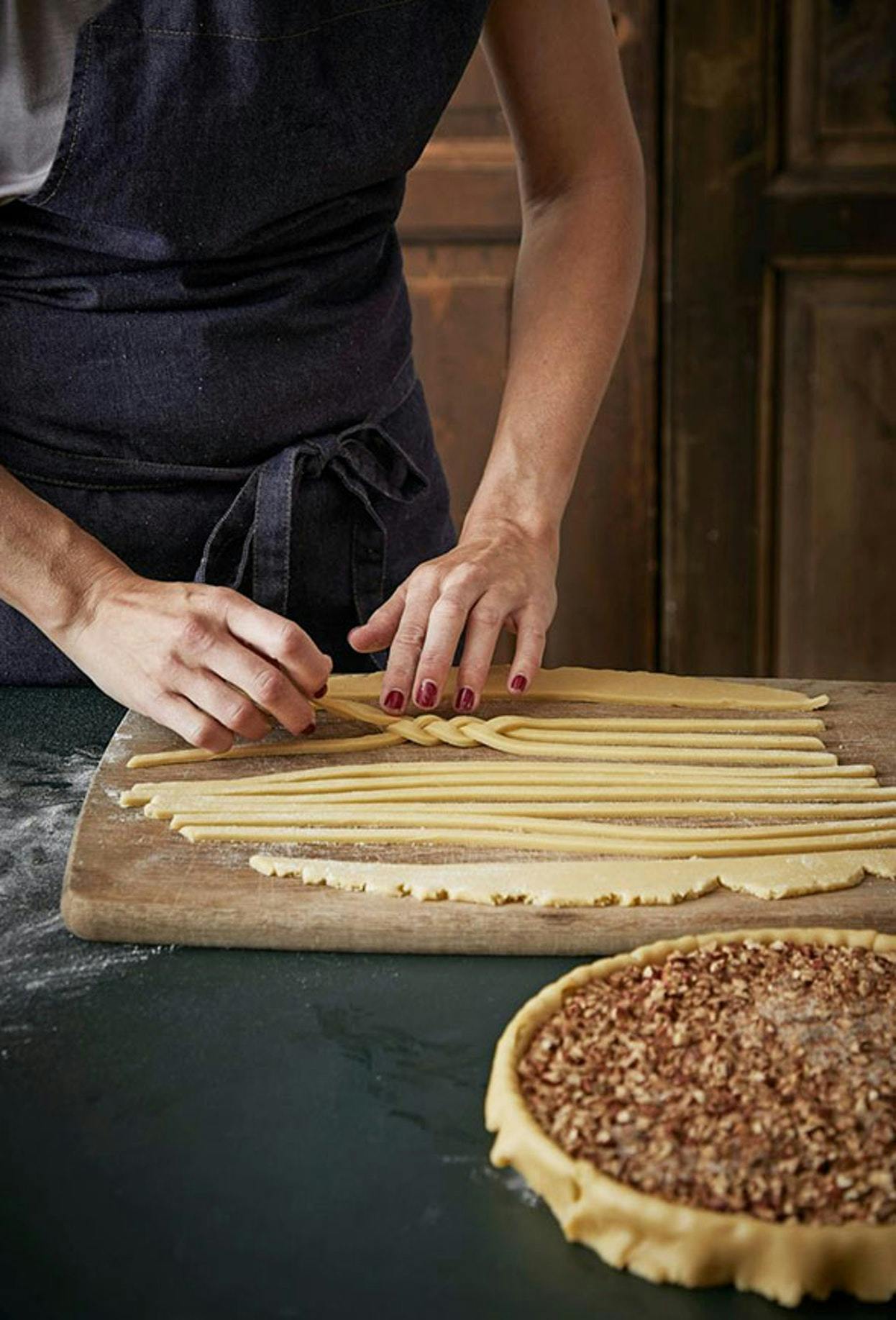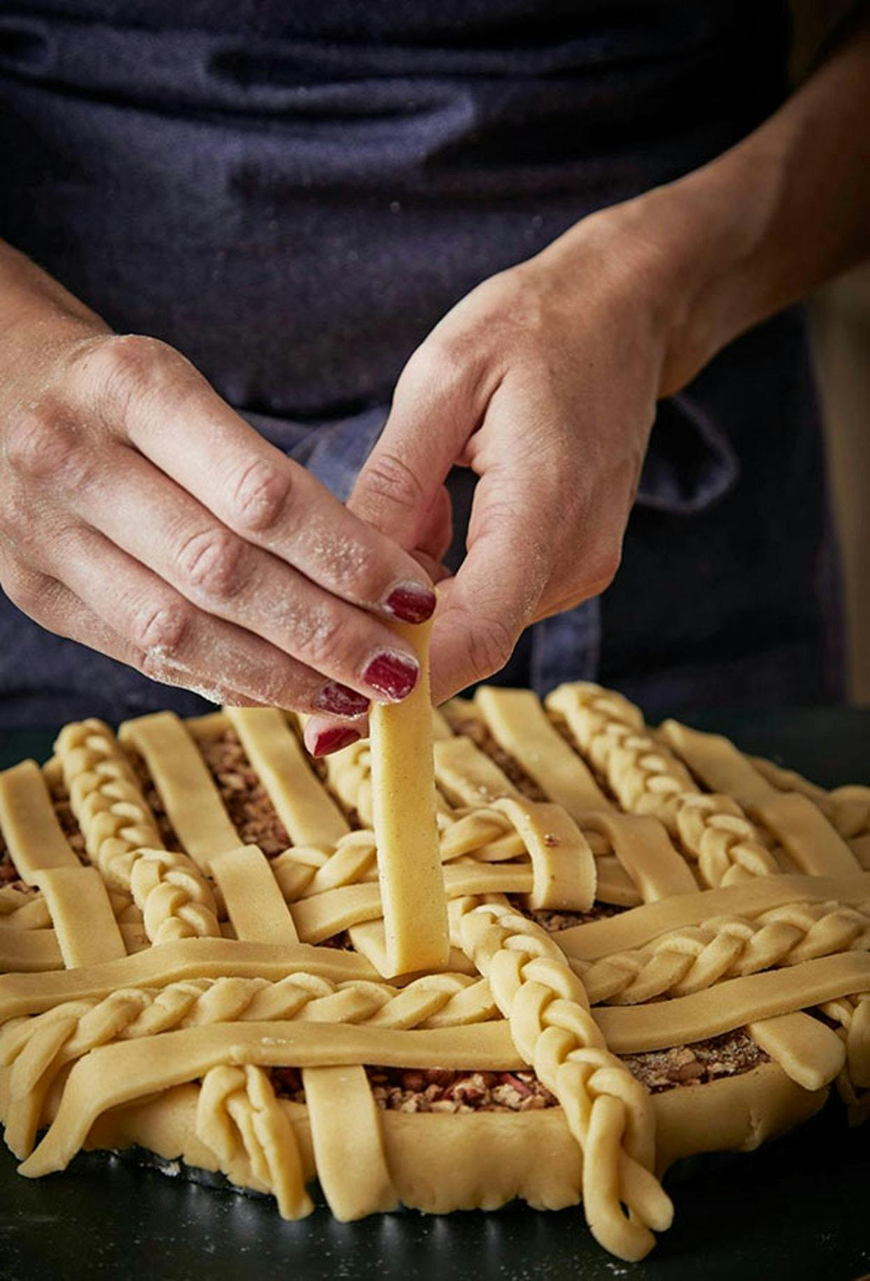Flet nu mørdejsstrimlerne og -fletningerne på modsatte led ind under de strimler, der allerede ligger på tærten.