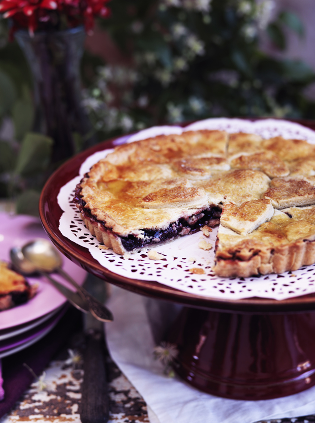 Skær små snit i låget, og bag kagen nederst i ovnen i ca. 35 minutter på 175°, til den er gylden.