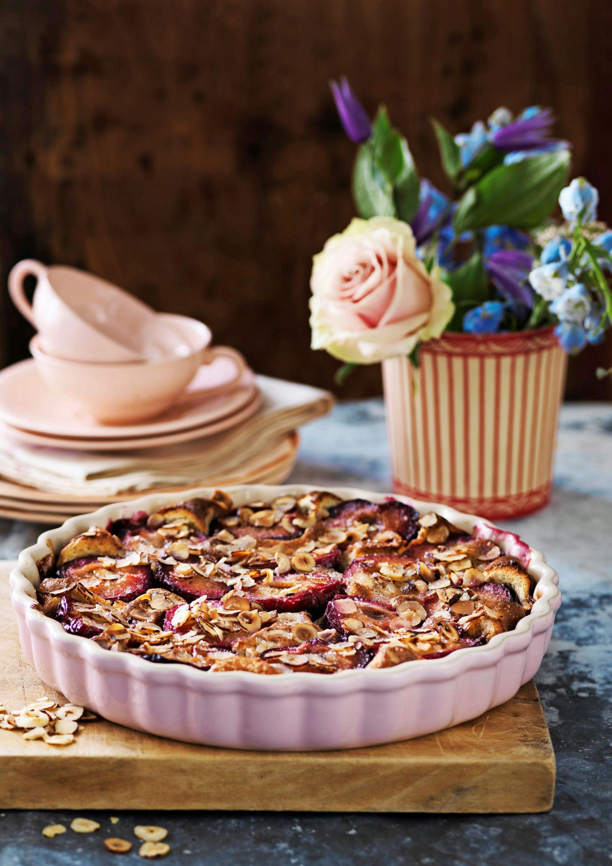 Læg blommerne i fadet med skærefladen opad, og drys med hasselnøddeflager og rørsukker.