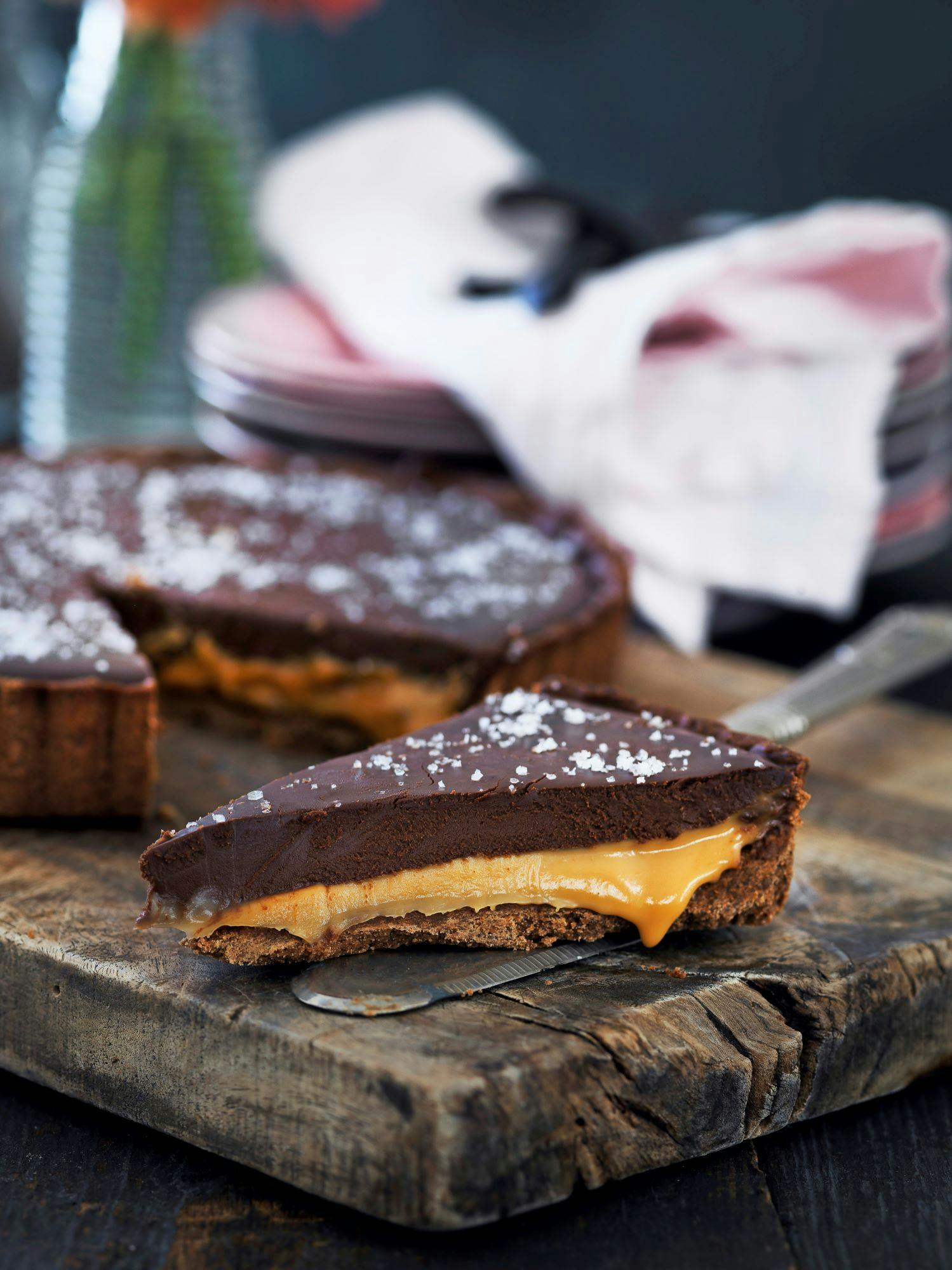 Hæld chokoldecremen over karamellaget i tærten, og sæt formen tilbage i køleskabet i mindst 2 timer.