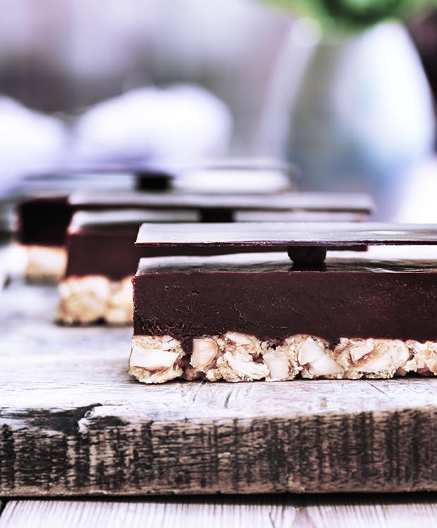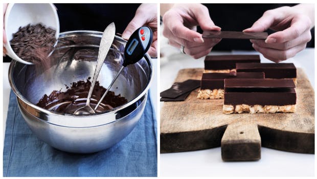 Dessertdronningen Maja Vase fremtrylller her en elegant chokoladetrøffelkage, som er det velsmagende punktum til en gæstemiddag. Den er bygget op af tre elementer, som alle er nemme at lave. Kunsten er dog at temperere chokoladen korrekt. Under opskriften finder du en guide til den perfekte temperering af chokolade.