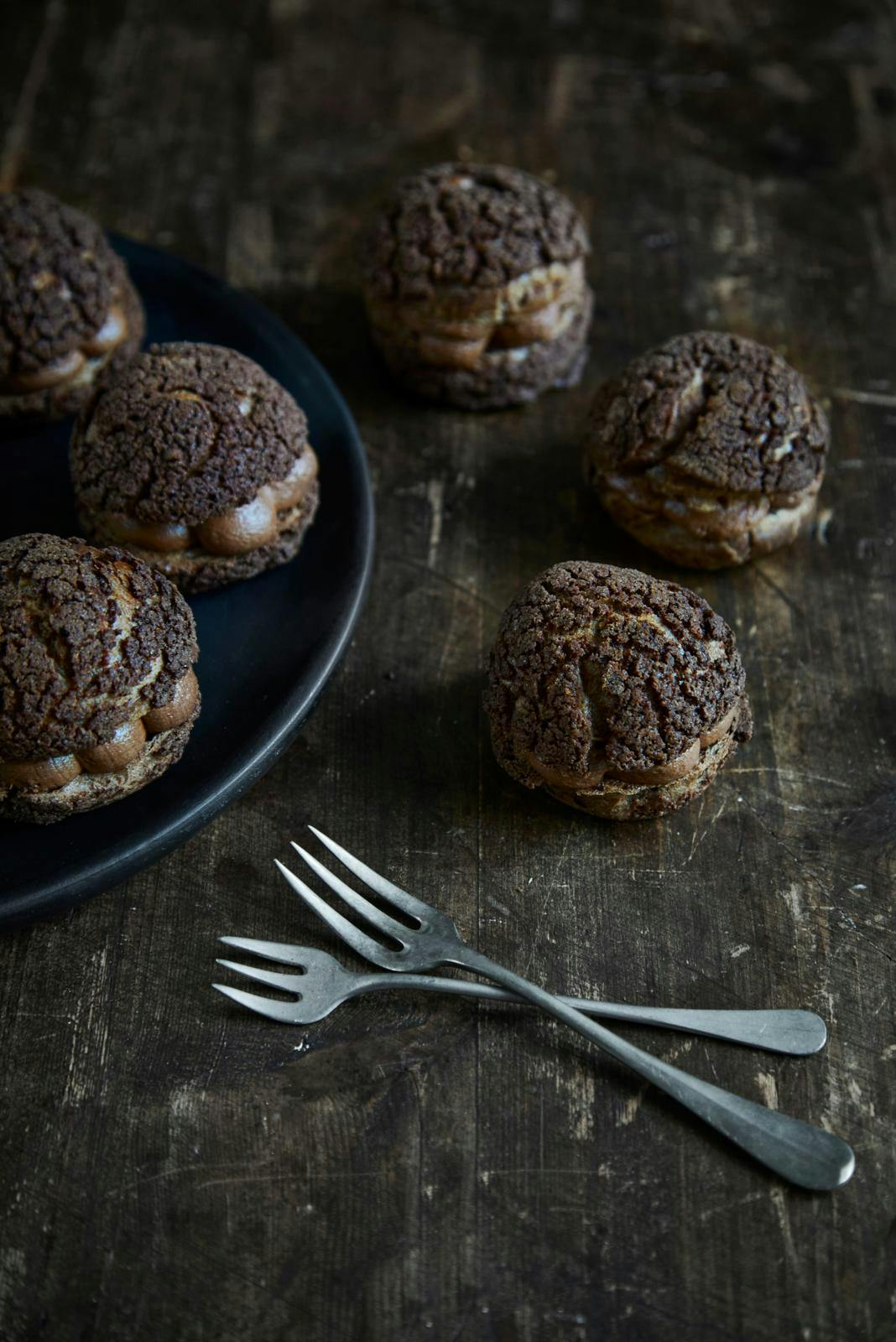 Choux au craquelin er vandbakkelser med en knasende kiksetop, her i en version fyldt med chokoladecreme – tankerne kommer straks henad fastelavnsboller – men det gode ved at holde fast i, at de hedder Choux au craquelin, er, at de kan serveres hele året uden skam. Her finder du opskriften.