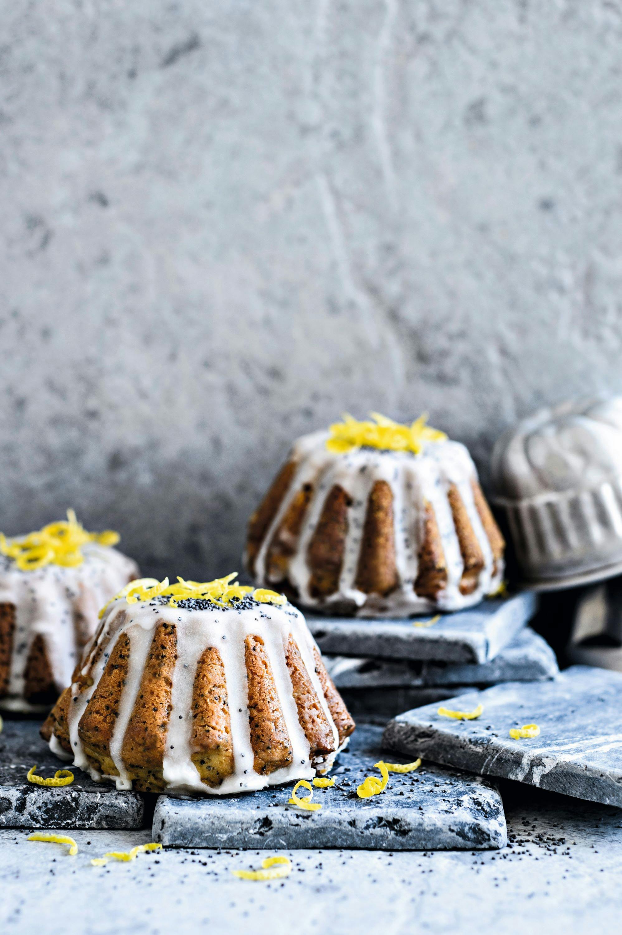Bland flormelis med resten af citronsaften til en passende glasur, og hæld den over kagerne.