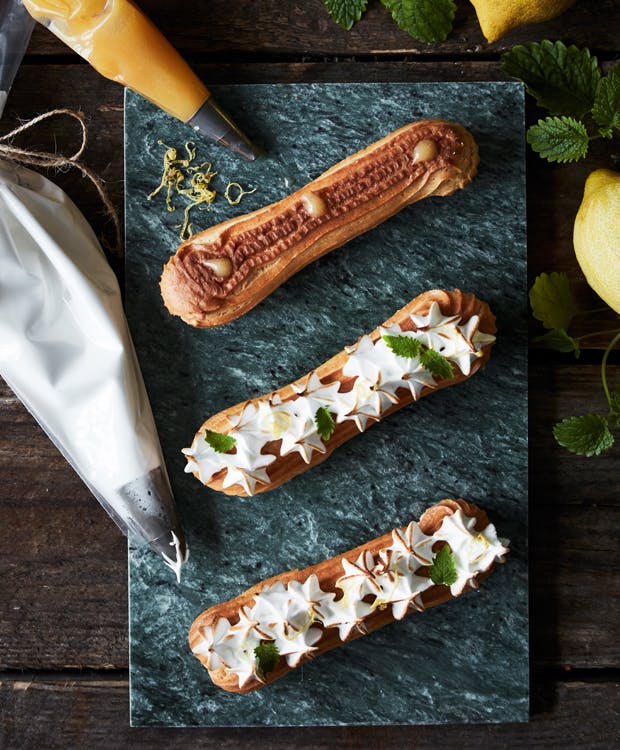 TIP: Lemoncurd kan købes færdig i de fleste supermarkeder, hvis man vil lave en hurtigere version af disse eclairs.