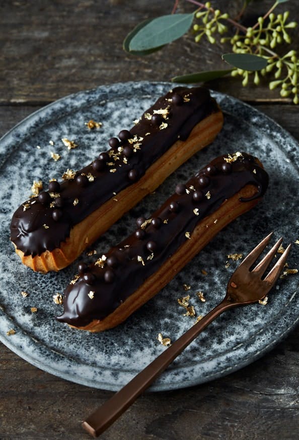 2. Dyp toppen af dine eclairs i chokoladeglacen, og pynt med chokoladekugler og guldstøv, inden chokoladeglacen stivner.